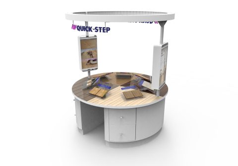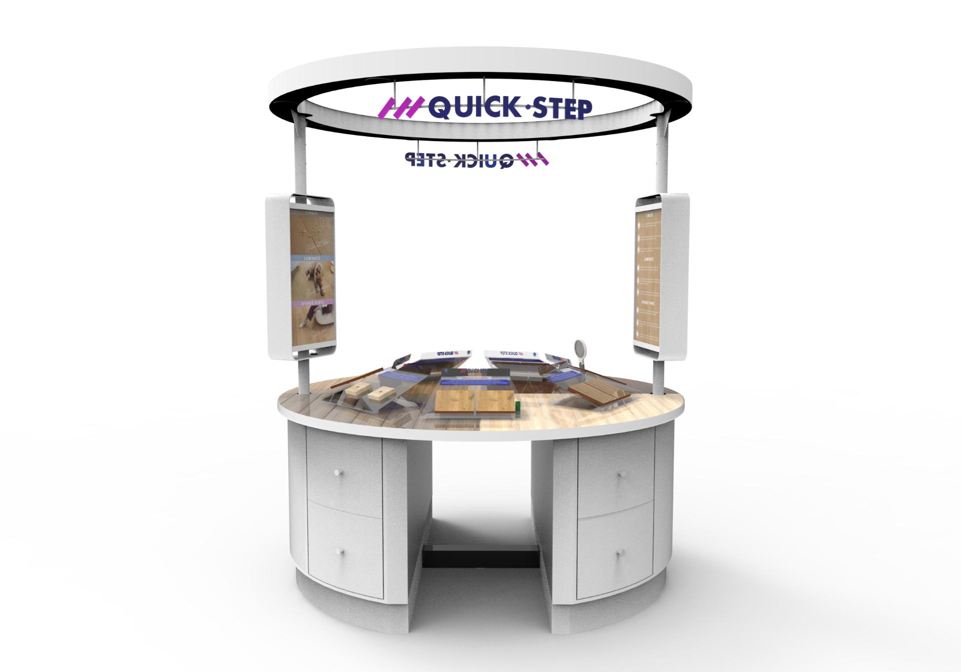 The final kiosk design included a tabletop display featuring a wide range of Quick-Step flooring samples, complemented by the rotating central podium that showcased the Pods.