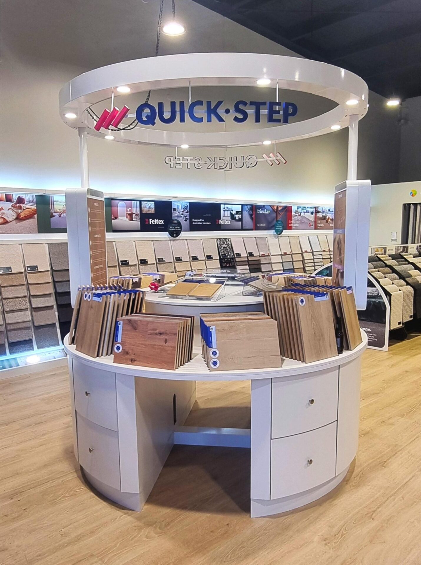 Premium Floors commissioned us to design a multi-functional, attention-grabbing kiosk that would serve as a central display and interactive area for their Quick-Step brand in retail flooring stores. The unit needed to be free-standing, highly engaging, and versatile enough to facilitate customer interaction and product education.